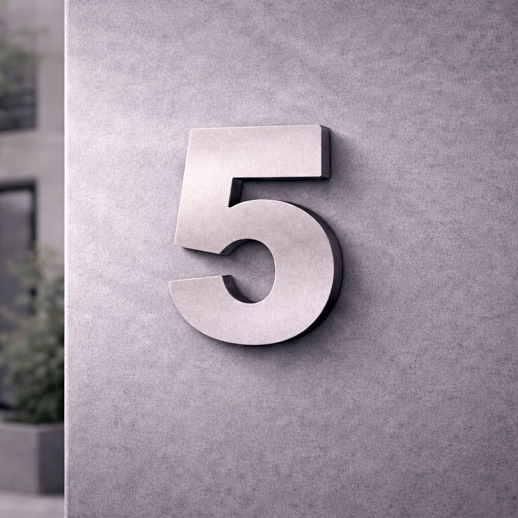 Tipo da placa: Placa predial de ACM com número 5 - MODELO 3D AÇO ESCOVADO- ALTO RELEVO