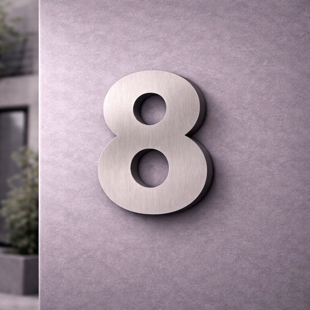 Tipo da placa: Placa predial de ACM com número 8 - MODELO 3D AÇO ESCOVADO- ALTO RELEVO
