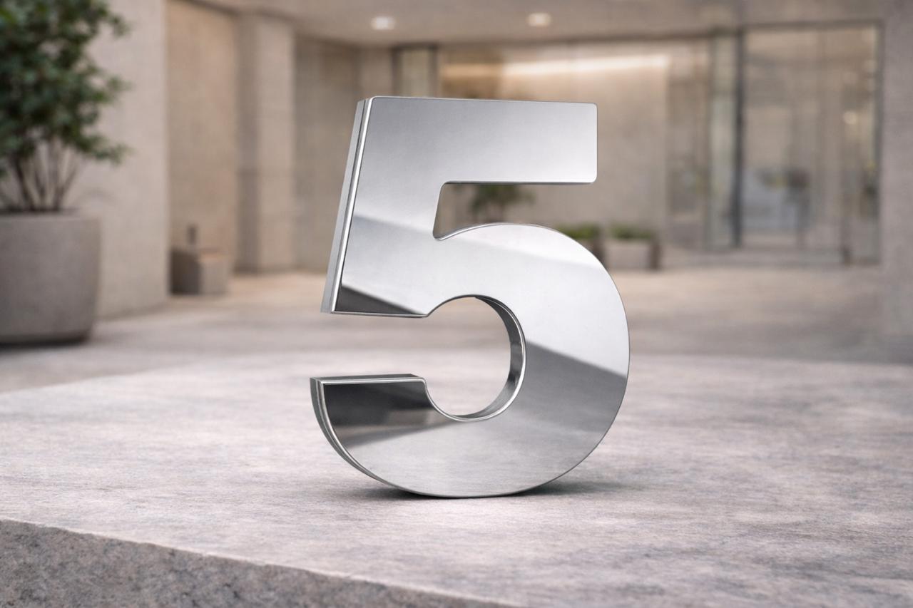 Tipo da placa: Placa predial de ACM com número 5 ESPELHO BRILHANTE