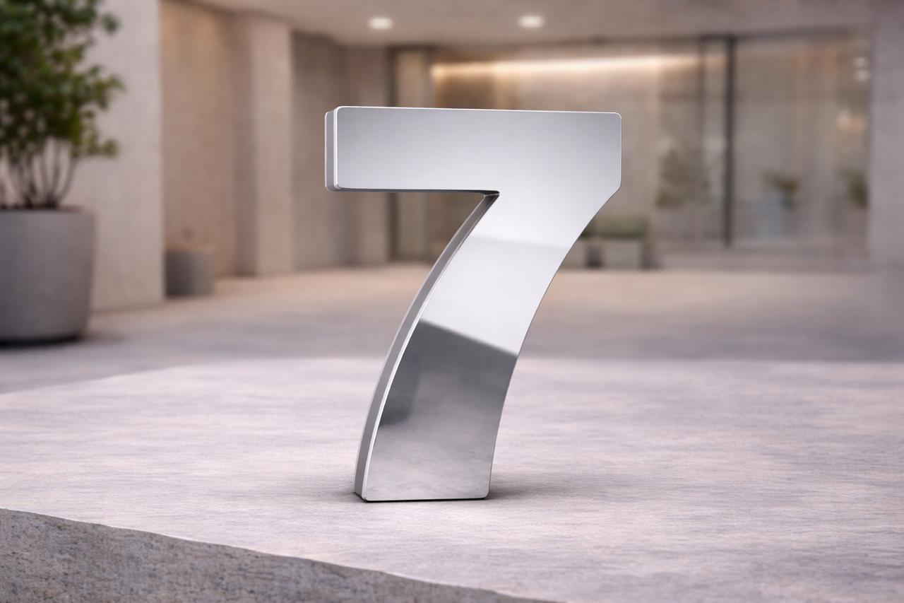 Tipo da placa: Placa predial de ACM com número 7 ESPELHO BRILHANTE