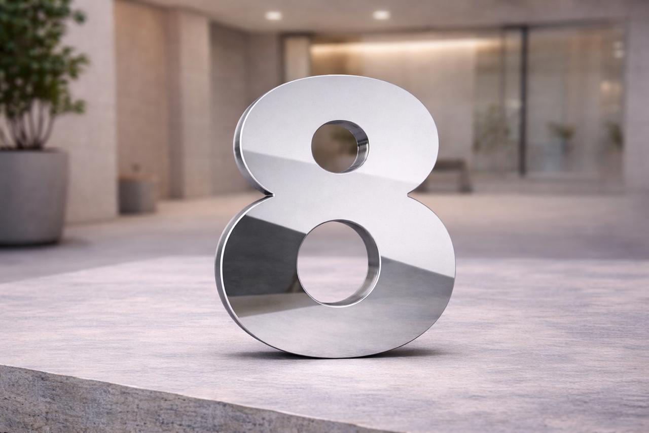 Tipo da placa: Placa predial de ACM com número 8 ESPELHO BRILHANTE